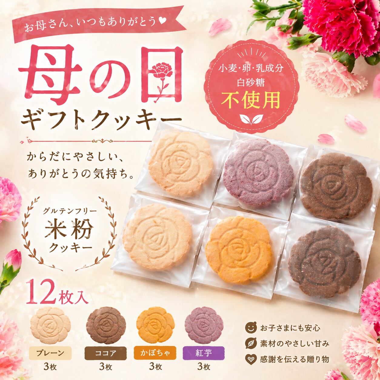 【母の日ギフト】米粉クッキー|4種類12枚入|グルテンフリー・卵・乳成分・白砂糖不使用